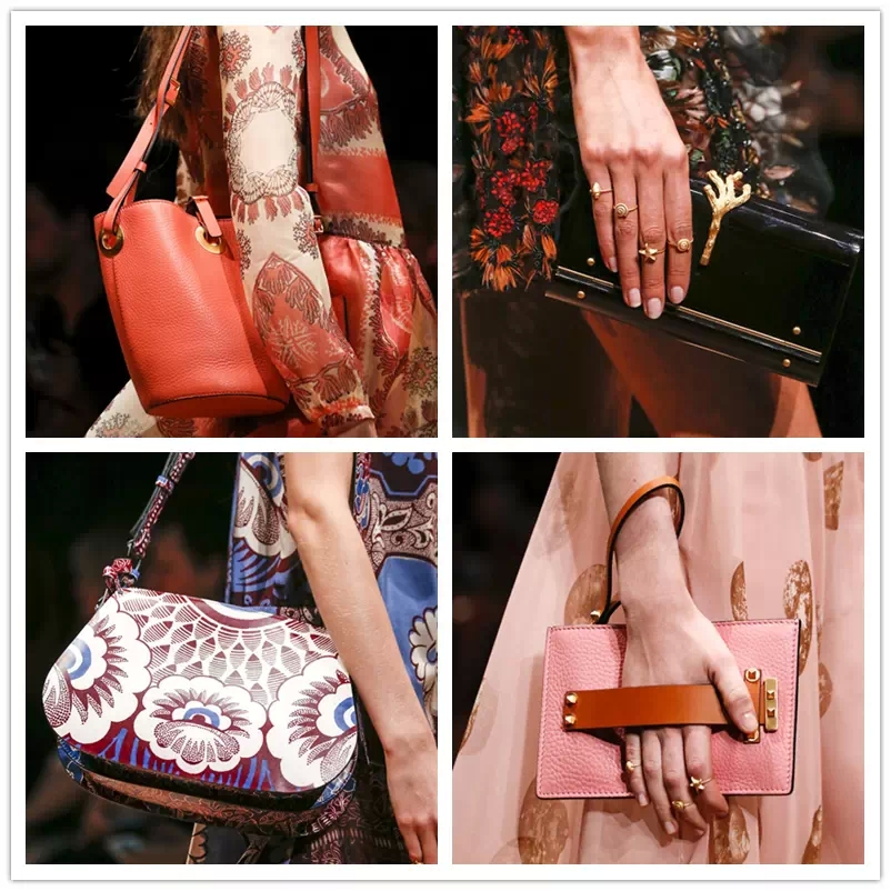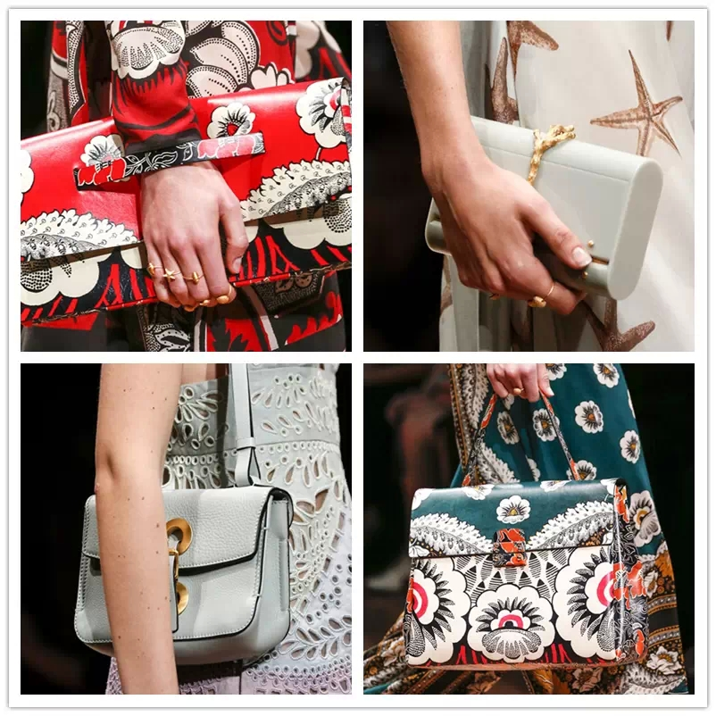 Valentino 2015春夏包包彌漫著一股濃濃的民族風(fēng)情,大面積彩色印花,精致的馬鞍扣,而Valentino標(biāo)志性的鉚釘元素卻只是象征性的出現(xiàn)了一些,也許是為了力推It Bag而刻意保留了鉚釘元素。